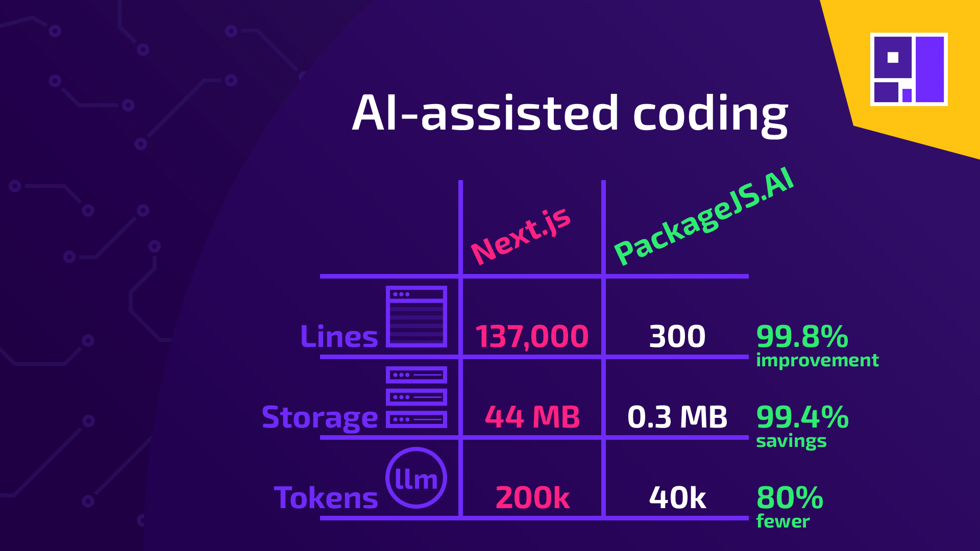 PackageJS + Claude Code generated 99.8% fewer lines of code than Next.js to make the exact same app. Less code means less to review, less to debug, less energy, and less cost. AI-assisted coding, (with other app builders like Next.js), generates too much code, making changes unpredictable and nearly impossible to review.